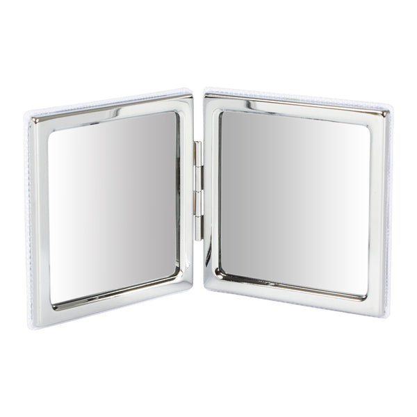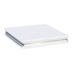 Espejo metálico cuadrado doble, con 2 tapas exteriores recubiertas en poliéster color blanco, para Sublimación. Contiene un espejo normal y el otro con aumento. Sistema de cierre magnético. Presentación en bolsa PP translúcido.
