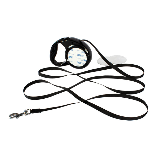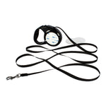 Correa extensible de 3mts para mascota, en plástico ABS negro, mosquetón de Acero inoxidable y correa de nylon color negro con sistema de traba. Contiene 2 compartimentos circulares y 2 placas metálicas blancas, para sublimar y pegar en ambos lados del producto.