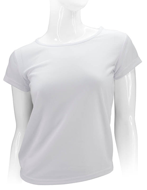 Polera 100% POLIÉSTER de 150gr/m2, para MUJER. Cuello redondo, manga corta. Presentación individual en bolsa de polipropileno transparente.