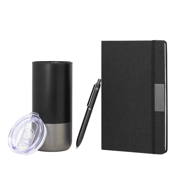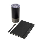 - 1 libreta color negro de 14 x 21 x 1,5 cm. Con placa metálica color gun de 5 x 2 cm. Tapa de cartón 300g recubierta en RPET 310. Interior de 80 hojas rayadas de 70g. Encuadernación cosida y cierre con banda elástica color negro.