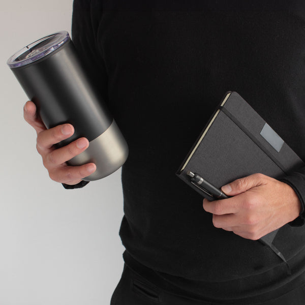 - 1 mug color negro combinado con gris gun en su base, de 8 x 17,6 cm. y 450 ml. Doble pared. Interior en polipropileno, exterior en acero inoxidable 201. Tapa plástica a presión con anillo de silicona.