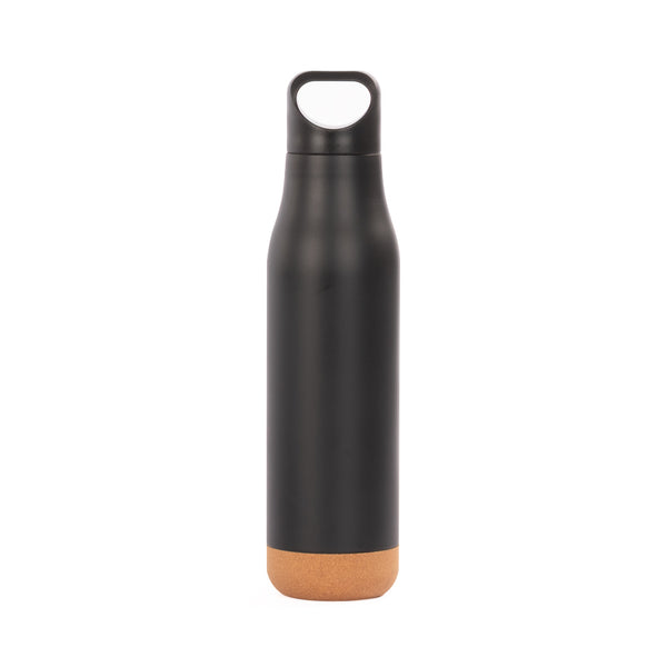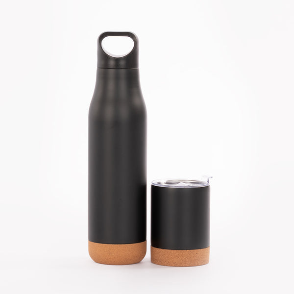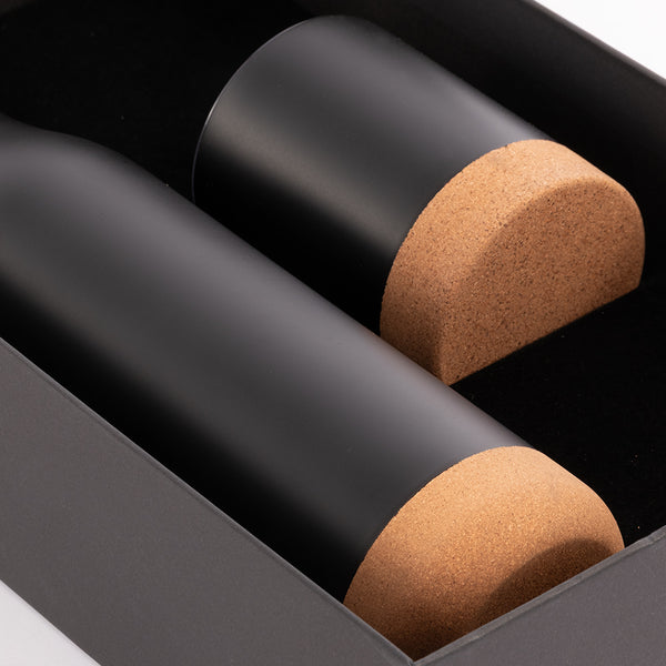 Set de Termo 1/2 litro con tapa twist-off con asa + Mug 200 cc con tapa removible de plástico PS Crystal Clear con sello cilíndrico de silicona, ambos en Acero Inoxidable color negro, con base aislante de corcho, para una mejor adhesión a la superficie. Producto BPA FREE, para el contacto con líquidos y alimentos. Presentación en elegante caja de carton color negro con tapa, interior cuna de EVA aterciopelada negra. Sobre funda de papel negro.